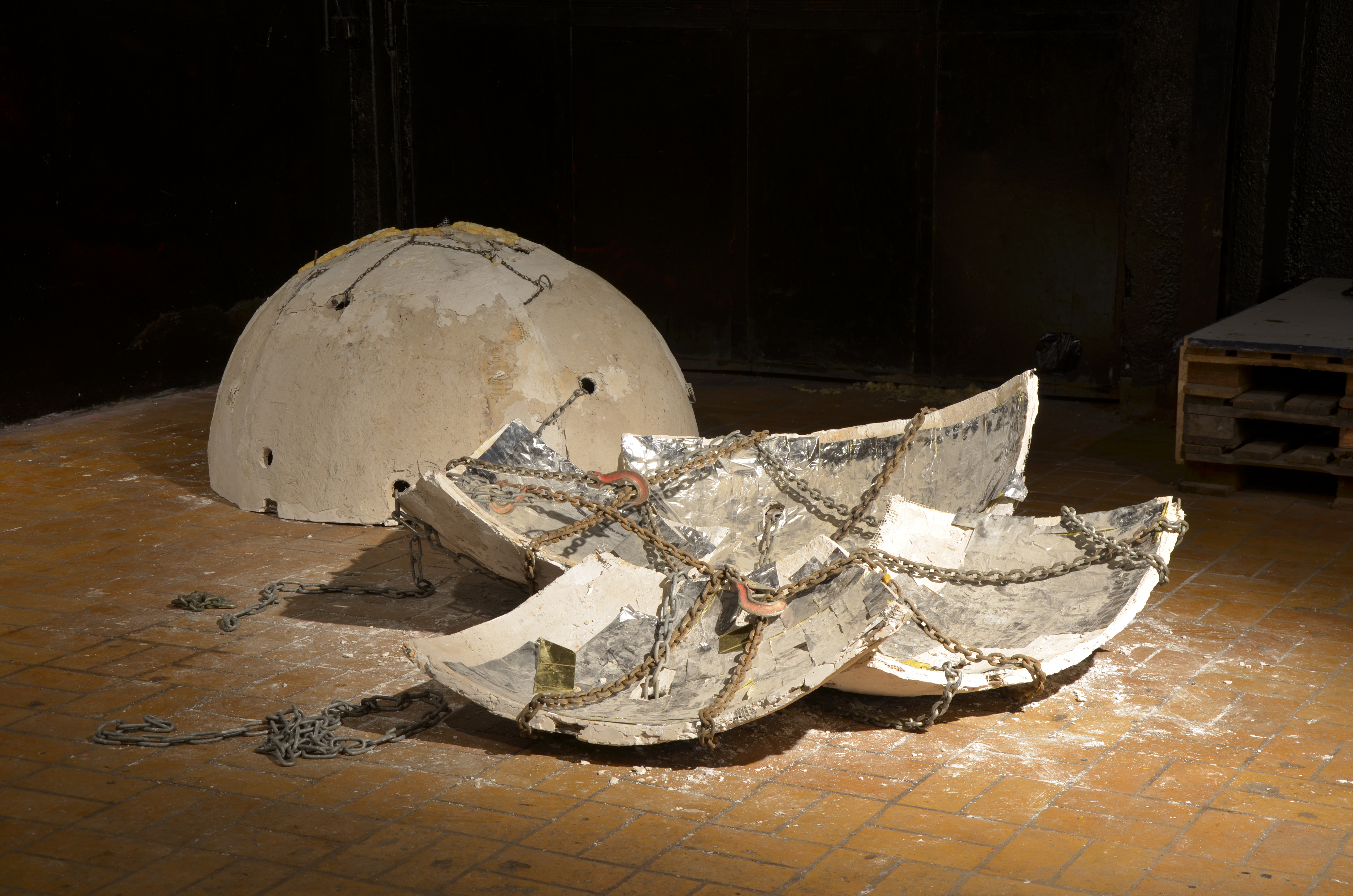 Installation, Maße: ca 320 x 320cm, Gips, Bauschaum, Rettungsfolie, Ketten, Papiermaché